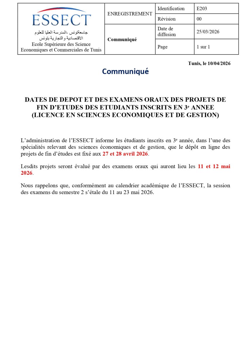 COMMUNIQUE : DATES DE DEPOT ET DES EXAMENS ORAUX DES PROJETS DE FIN D’ETUDES DES ETUDIANTS INSCRITS EN 3ᵉ ANNEE (LICENCE EN SCIENCES ECONOMIQUES ET DE GESTION)
