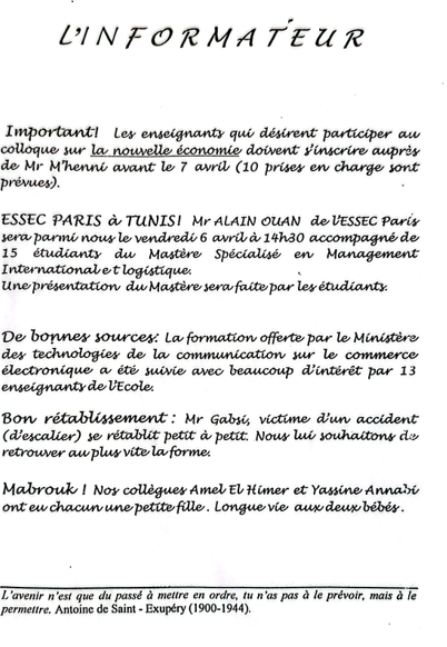 La communication avec les enseignants était simple et régulière. Les informations circulaient d’abord par affichage, puis à travers la newsletter, L’Informateur. Les consignes importantes, elles, étaient transmises directement (voir note ci-dessous relative aux premiers partiels).